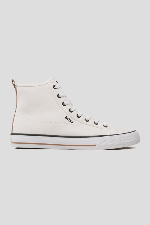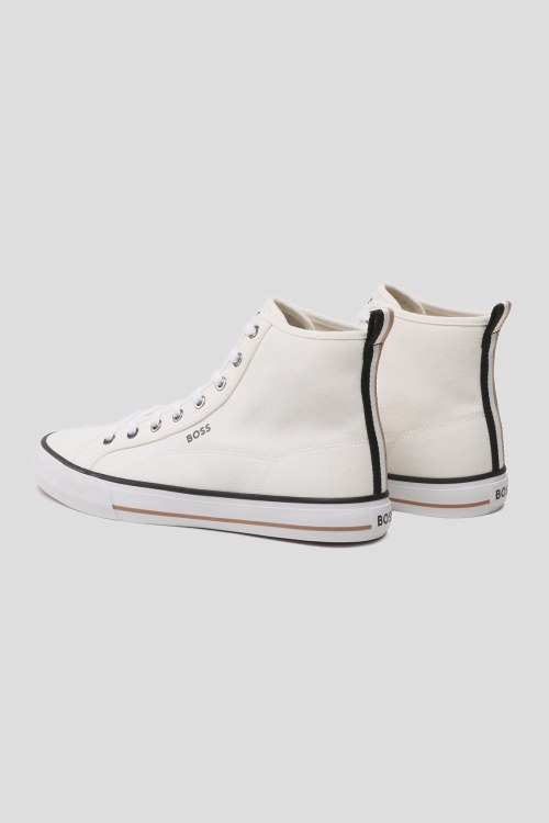 Мужские белые текстильные высокие кеды Aiden от Hugo Boss (Хуго Босс). Логотип сбоку и на язычке, петля для подтягивания сзади, классическая шнуровка, закругленный носок, резиновая подошва. Соответствие размеров: EU: 41; UK: 7; US: 8