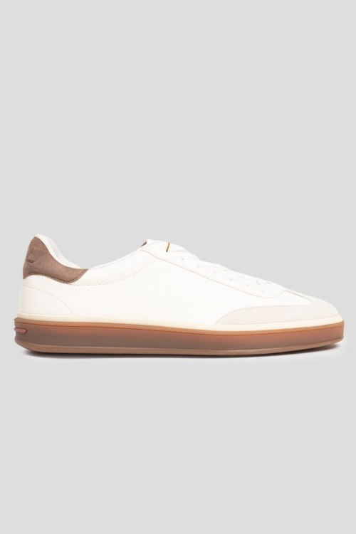 Детали: Мужские белые кожаные кеды от Loro Piana (Лоро Пьяна). Модель из зернистой кожи, логотип сбоку на пятке, классическая шнуровка, закругленный носок, коричневая подошва. Обувь категории outlet, коробка может быть повреждена