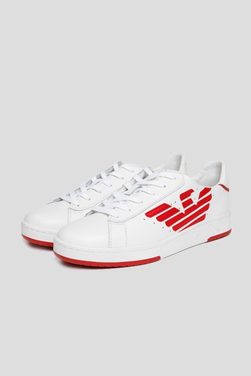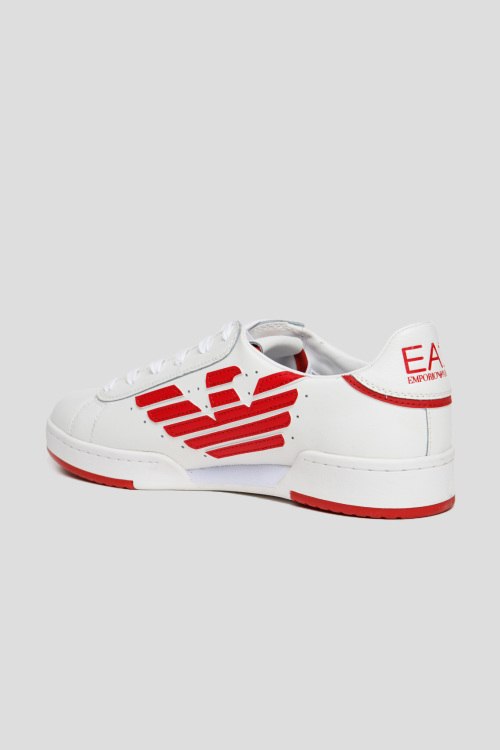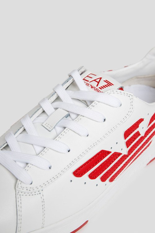 Детали: Мужские белые кеды из натуральной кожи от EA7 Emporio Armani (ЕА7 Эмпорио Армани). Закругленный носок, комбинация цветов, спереди шнуровка, перфорированные вставки, резиновая подошва, логотип бренда, патч-лого на язычке