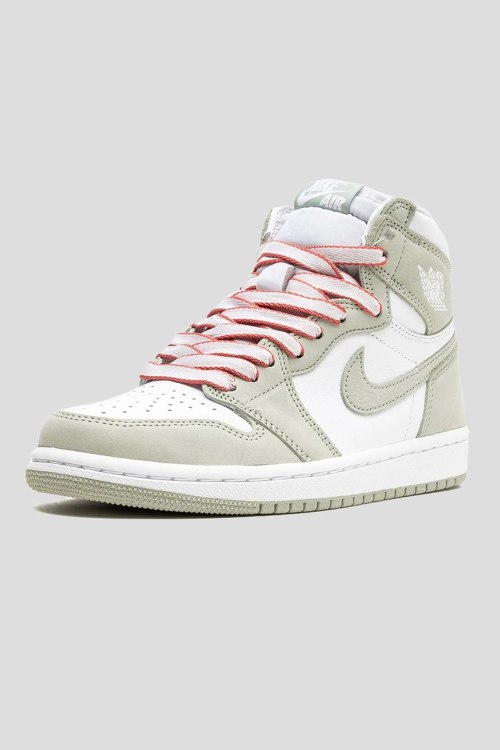 Мужские бело-оливковые хайтопы из кожи и нубука Air Jordan 1 High OG Seafoam от Nike (Найк). Комбинация цветов и материалов, логотип сбоку и на язычке, классическая шнуровка, закругленный носок с перфорированным дизайном, резиновая подошва