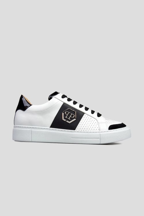 Детали: Мужские черно-белые кеды из натуральной кожи от Philipp Plein (Филипп Плейн). Закругленный носок, плоская подошва, классическая шнуровка, перфорация, лакированные вставки, металлический логотип сбоку