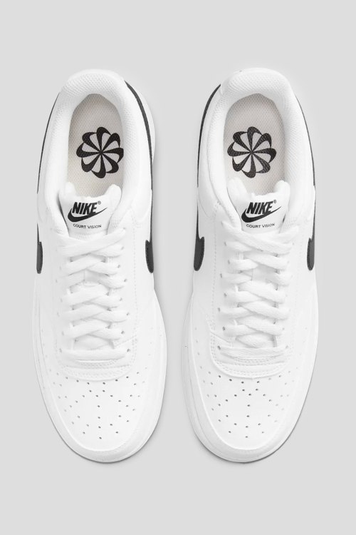 Детали: Мужские белые кеды из экокожи Nike Court Vision от Nike (Найк). Логотип сбоку и на язычке, классическая шнуровка, закругленный носок, резиновая подошва