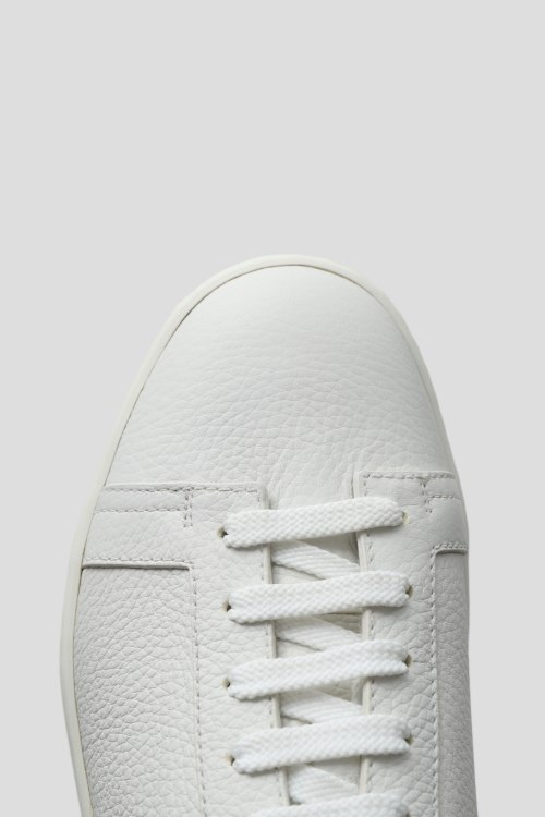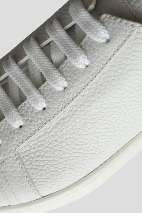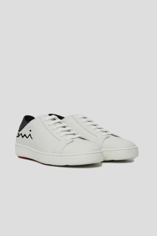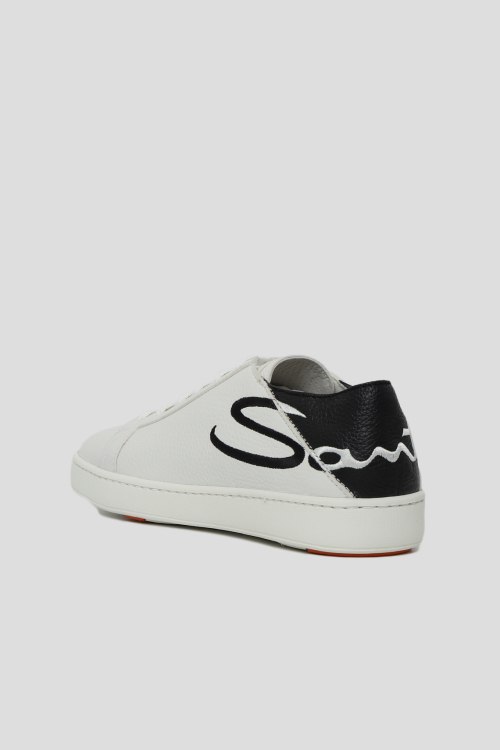 Детали: Мужские белые кеды из натуральной кожи от Santoni (Сантони). Черный задник с вышитым логотипом, классическая шнуровка, закругленный носок