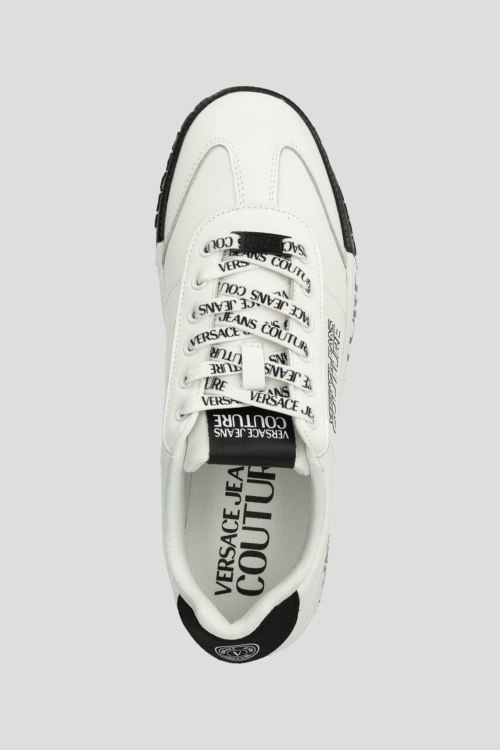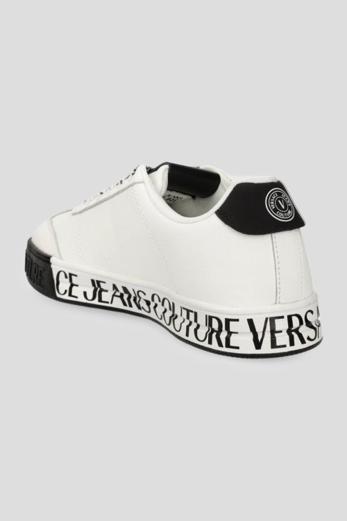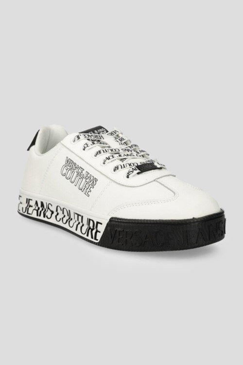 Мужские белые кеды из натуральной кожи от Versace Jeans Couture (Версаче Джинс Кутюр). Закругленный носок, спереди классическая шнуровка, резиновая подошва, брендированный принт