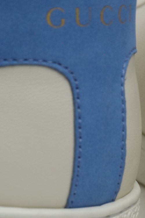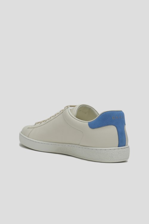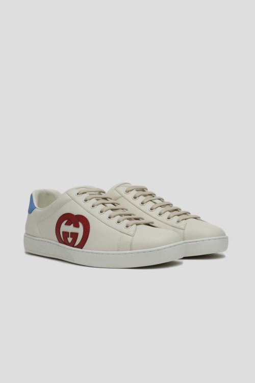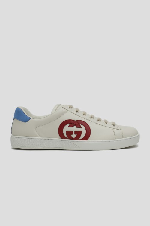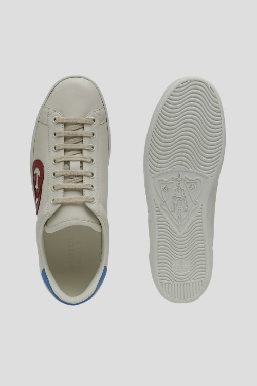 Мужские бежевые кеды Ace из натуральной кожи от Gucci (Гуччи). Модель декорирована логотипом Interlocking-G цвета бордо на внешней стороне обуви, голубым контрастным задником с логотипом. Классическая шнуровка, закругленный носок, белая плоская подошва из каучука. Комплектация: фирменная коробка, два фирменных пыльника.