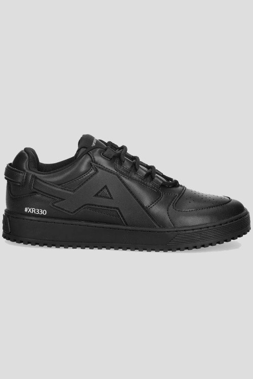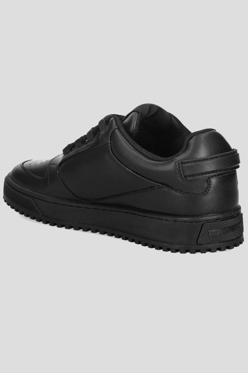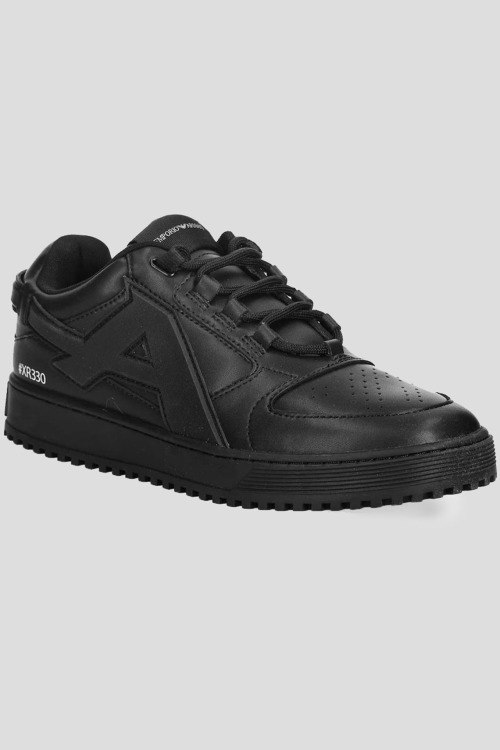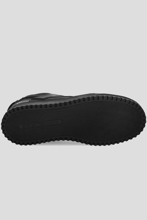 Детали: Мужские черный кеды из экокожи от Emporio Armani (Эмпорио Армани). Заакругленный носок с перфорацией, спереди снуровка, брендированная нашивка, резиновая подошва в тон изделия