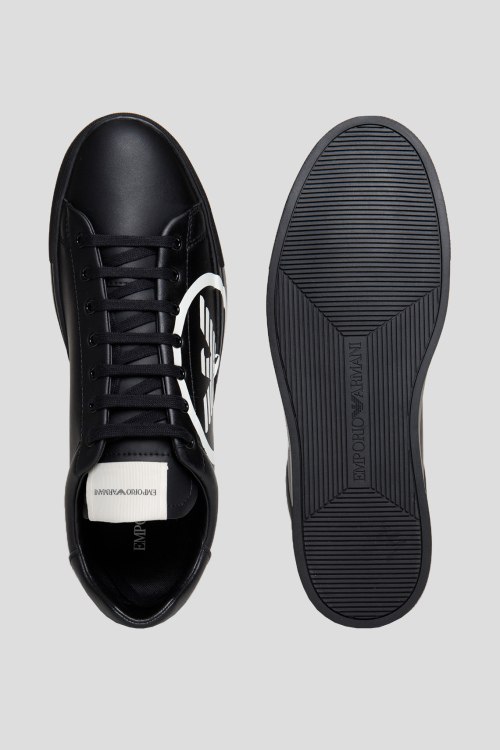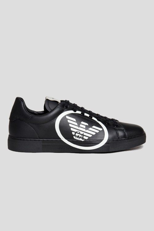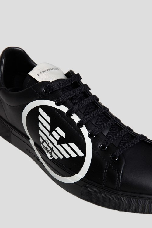 Мужские черные кеды из натуральной кожи от Emporio Armani (Эмпорио Армани). Закругленный носок, спереди классическая шнуровка, нашивка с логотипом бренда на язычке, принт с лого сбоку изделия