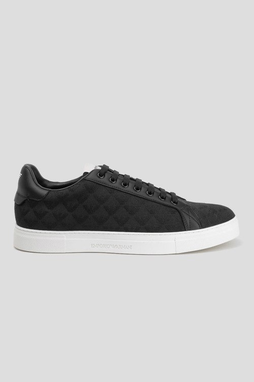 Детали: Мужские черные кеды из натуральной кожи и текстиля от Emporio Armani (Эмпорио Армани). Закругленный носок, спереди классическая шнуровка, комбинированный дизайн, рельефная подошва, патч-лого
