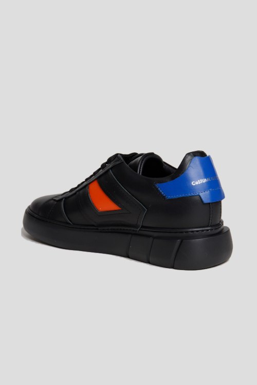 Мужские черные кеды из натуральной кожи от Costume National (Костюм Националь). Закругленный носок, спереди классическая шнуровка, контрастные вставки оранжевого цвета сбоку и синего на заднике, логотип бренда, резиновая подошва