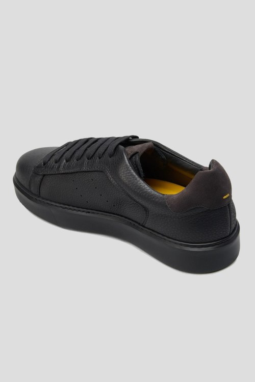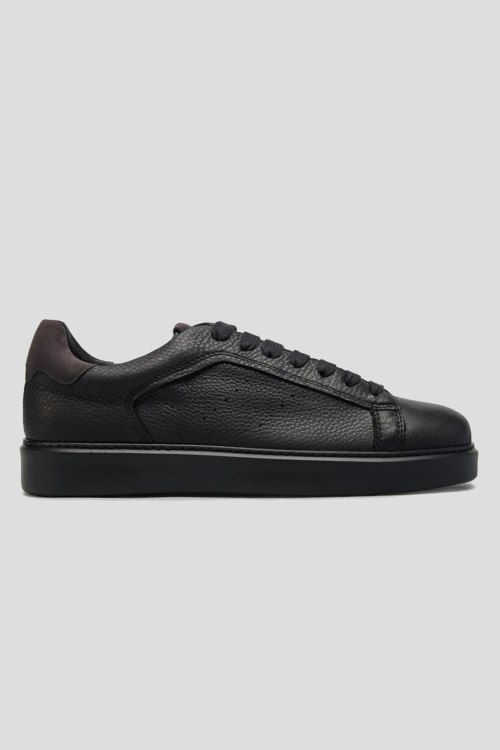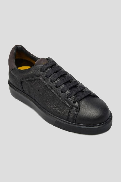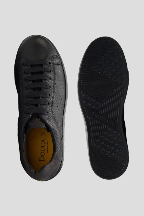 Детали: Мужские черные кожаные кеды от Doucal's (Дукалс). Модель из зернистой кожи, логотип на язычке, классическая шнуровка, закругленный носок