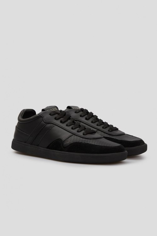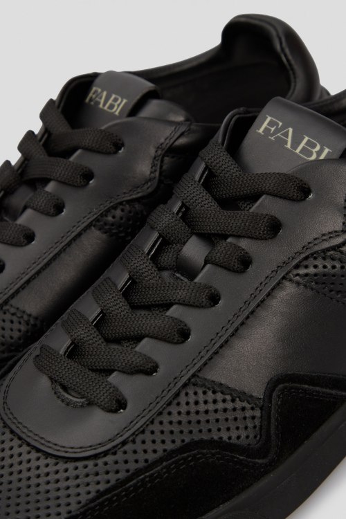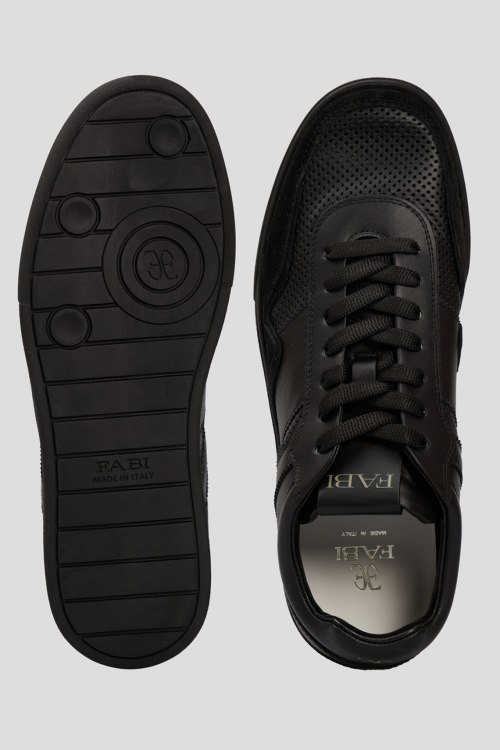 Детали: Мужские черные кеды из натуральной кожи и замши от Fabi (Фаби). Закругленный носок, спереди классическая шнуровка, перфорация, патч-лого, резиновая подошва в тон изделия