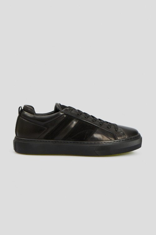 Мужские черные кеды из натуральной кожи от Fabi (Фаби). Закругленный носок, замшевые вставки, спереди классическая шнуровка, резиновая подошва, логотип бренда.