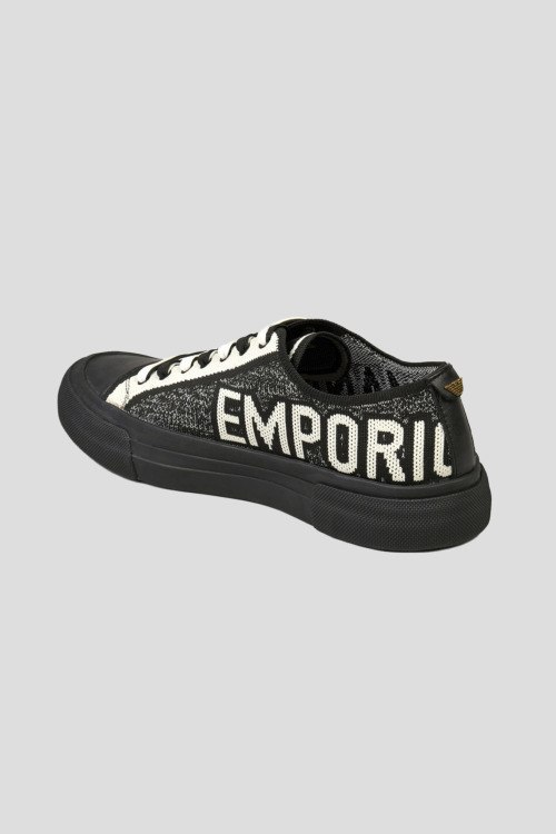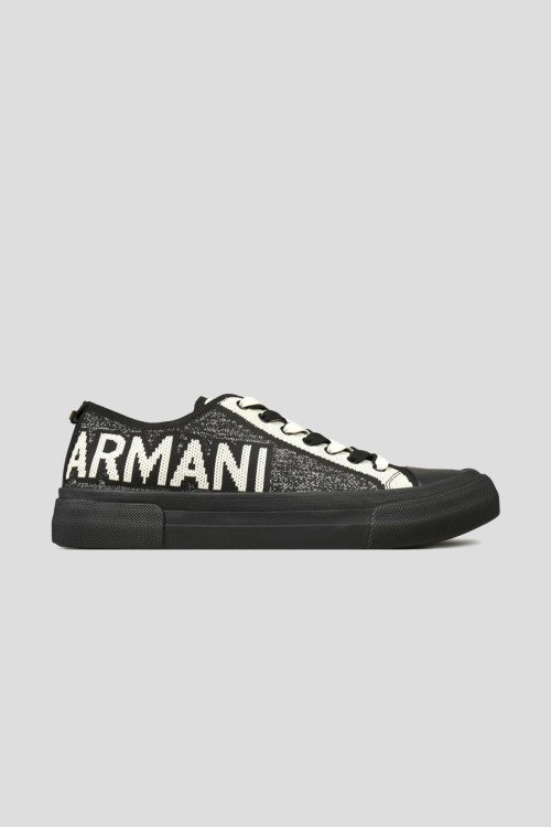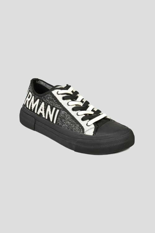 Детали: Мужские черно-белые текстильные кеды от Armani (Армани). Комбинация цветов, логотип сбоку, классическая шнуровка, закругленный носок, черная подошва