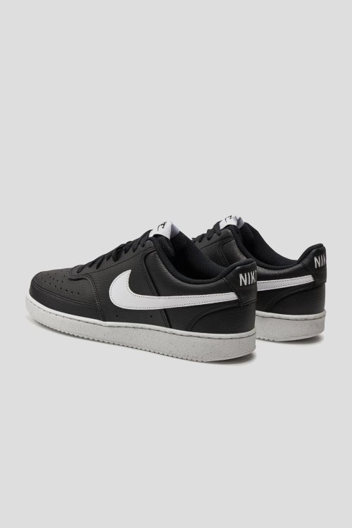 Детали: Мужские черные кеды из экокожи Nike Court Vision от Nike (Найк). Логотип сбоку и на язычке, классическая шнуровка, закругленный носок, резиновая подошва