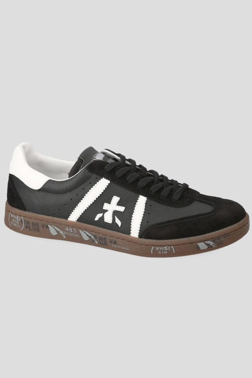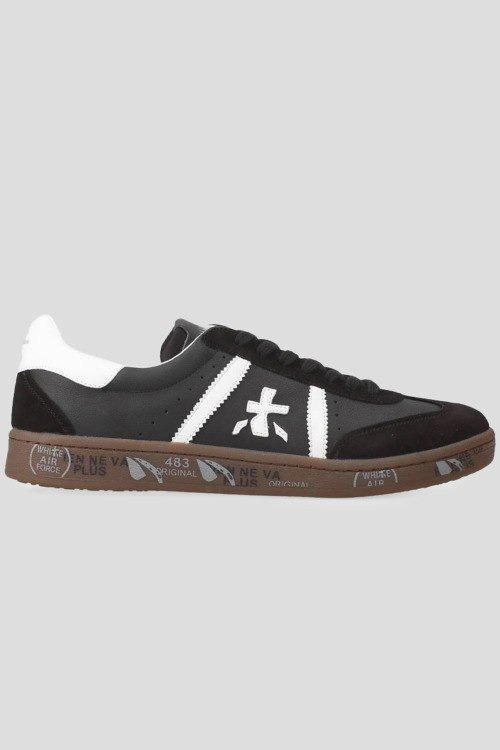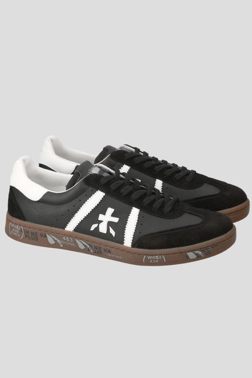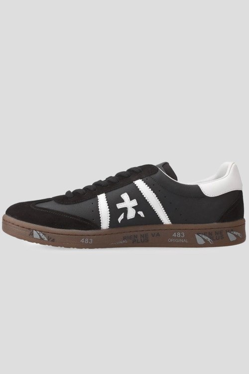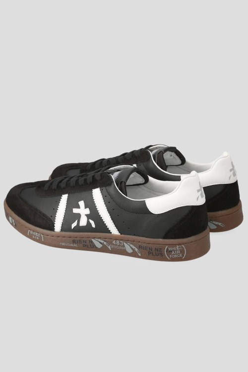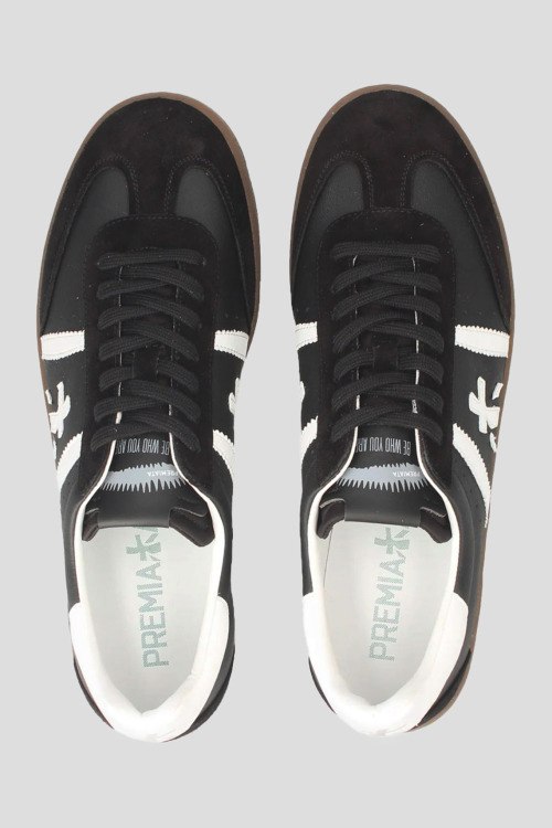 Детали: Мужские черные кеды из кожи от Premiata (Премиата). Комбинированный дизайн, закругленный носок, спереди классическая шнуровка, резиновая подошва, контрастные вставки, логотип бренда