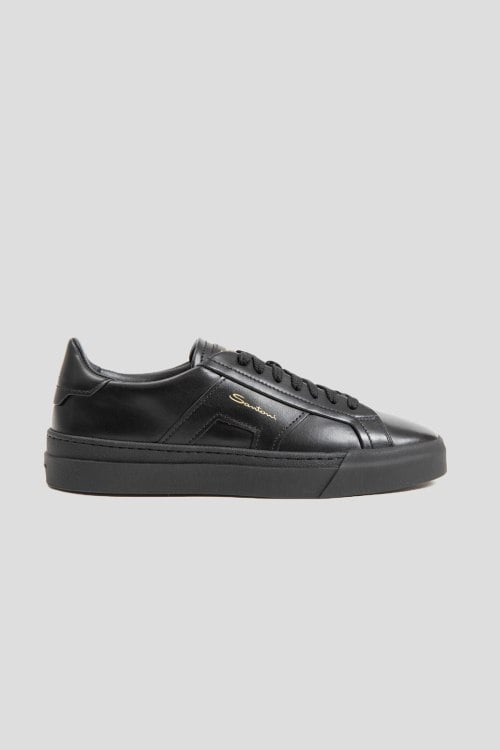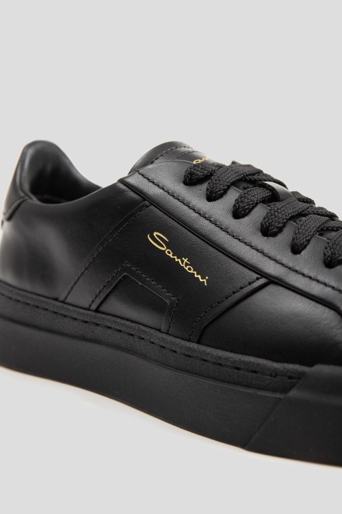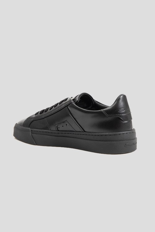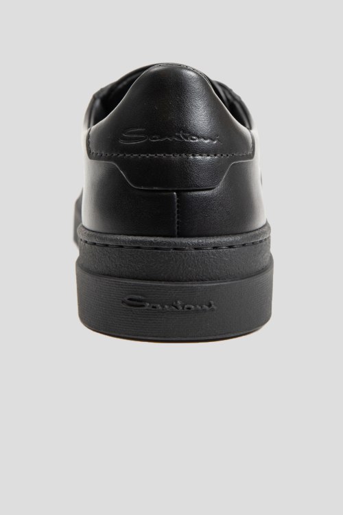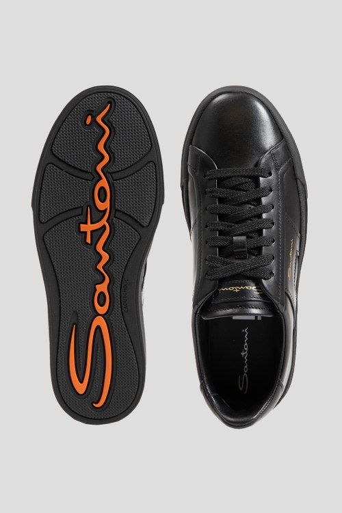 Детали: Мужские черные кеды из натуральной кожи от Santoni (Сантони). Закругленный носок, спереди классическая шнуровка, резиновая подошва, логотип бренда, кожаная стелька