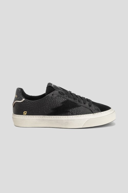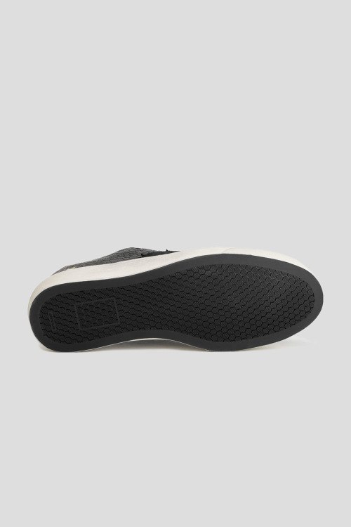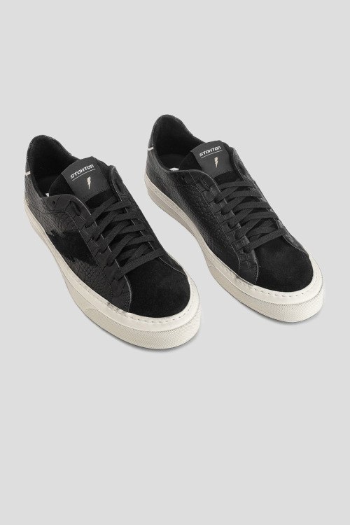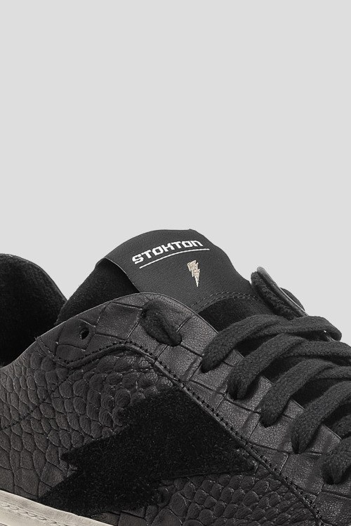 Детали: Мужские черные кожаные кеды от Stokton (Стоктон). Тиснение под кожу змеи, логотип на пятке и на язычке, классическая шнуровка, закругленный носок, белая подошва