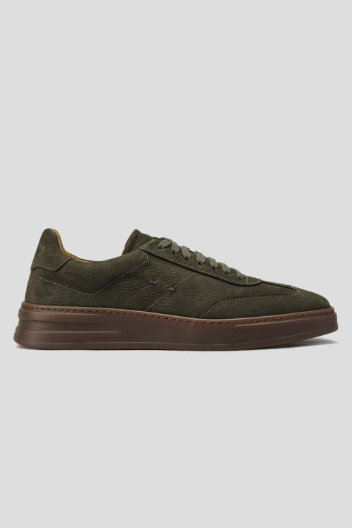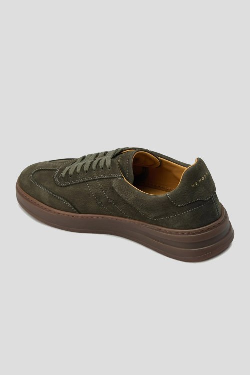 Детали: Мужские кеды из нубука цвета хаки от Henderson Baracco (Хендерсон Баракко). Логотип на пятке и на язычке, классическая шнуровка, закругленный носок