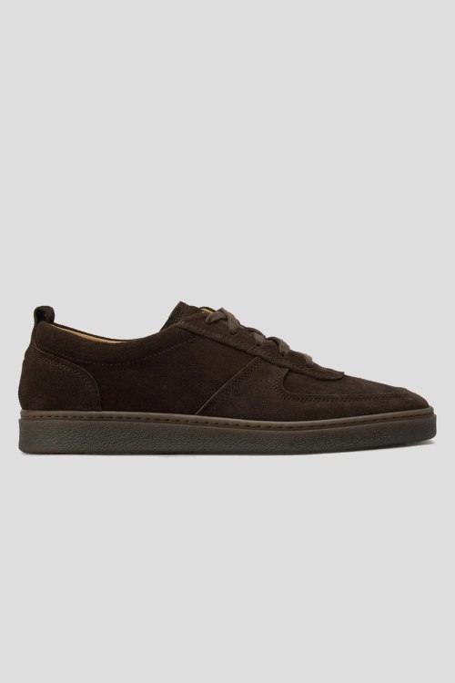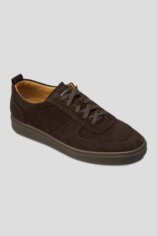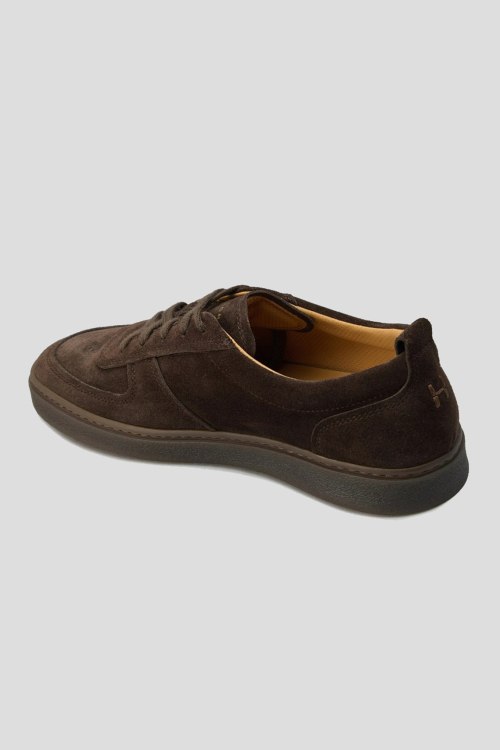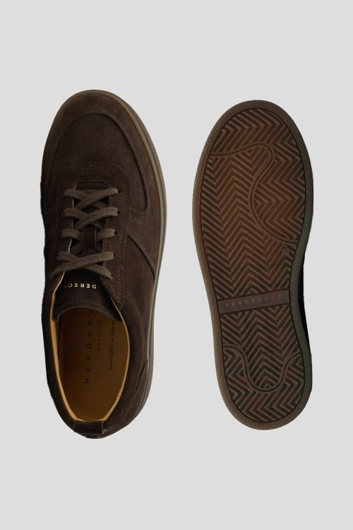 Детали: Мужские темно-коричневые замшевые кеды от Henderson Baracco (Хендерсон Баракко). Логотип на язычке, классическая шнуровка, закругленный носок