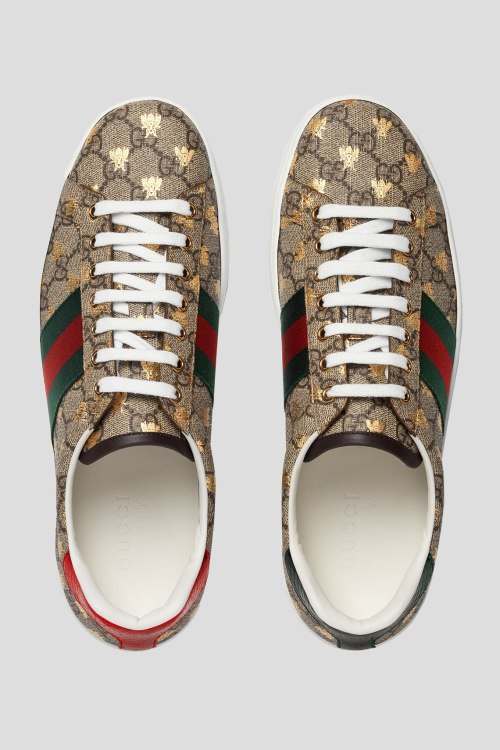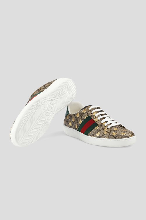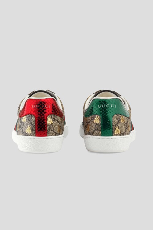 Мужские коричневые кеды Ace из канвы от Gucci (Гуччи). Дизайн в стиле ретро с лентой Web по бокам, навеян кроссовками Gucci 1970-х годов. Закругленный носок, спереди классическая шнуровка, канва GG Supreme бежево-коричневого цвета, белая подошва из каучука (резины), логотип бренда на заднике. Низкие кроссовки украшены металлизированными пчелами золотистого цвета. Детали из кожи под рептилию на задниках: на одном — зеленого цвета, на другом — красного. Комплектация: фирменная коробка, 2 фирменных пыльника. Модель 548950 9N050 8465