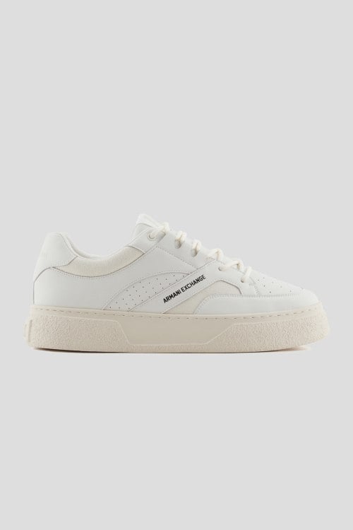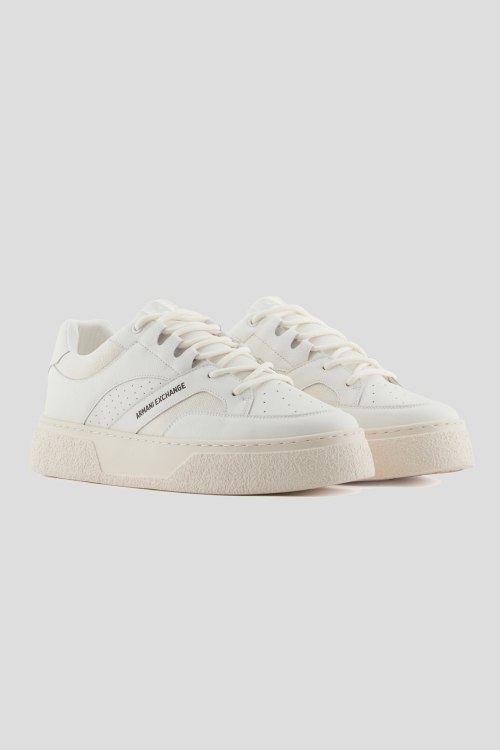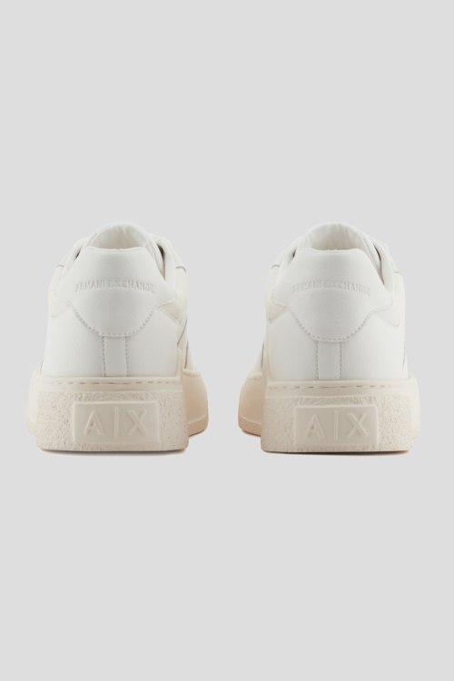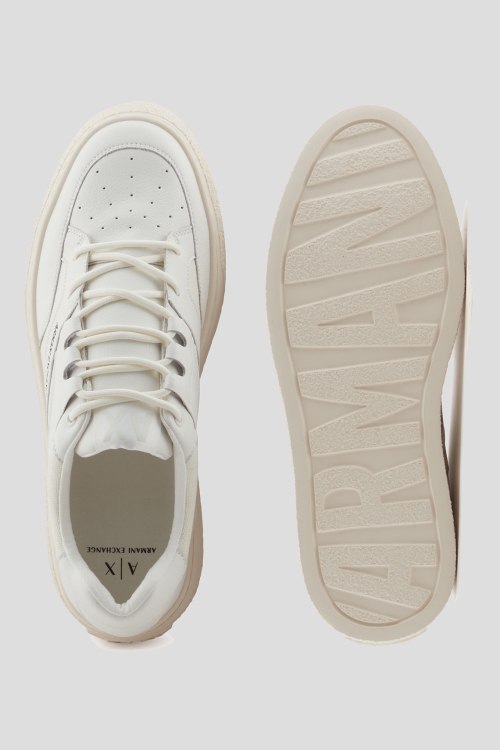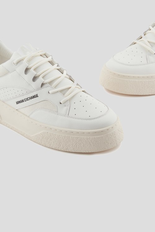 Детали: Мужские кеды молочного оттенка из кожи и текстиля от Armani Exchange (Армани Эксчендж). Комбинация цветов и материалов, логотип сбоку и на язычке, классическая шнуровка, закругленный носок
