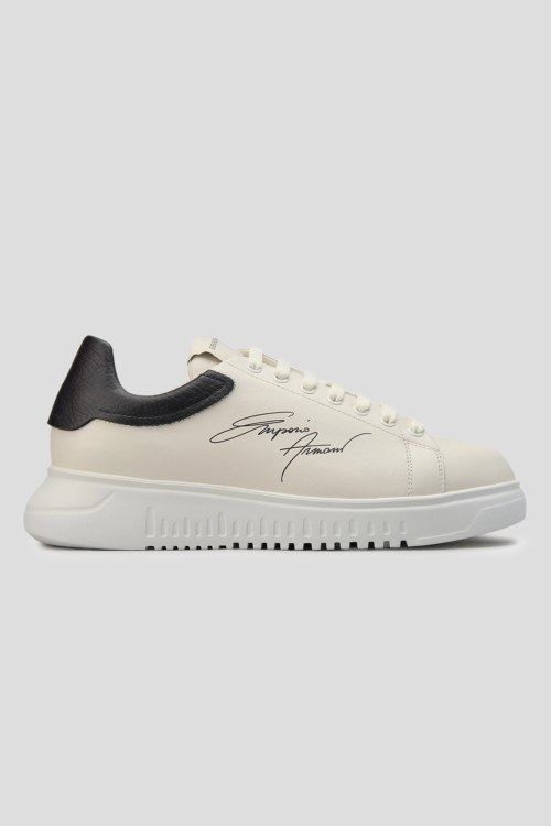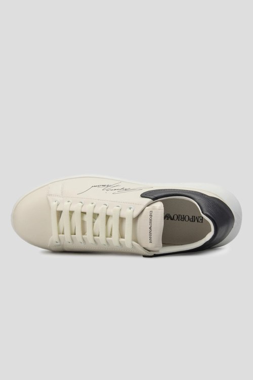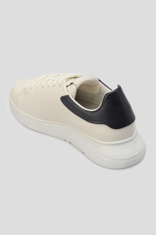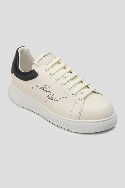 Детали: Мужские кожаные кеды молочного оттенка от Emporio Armani (Эмпорио Армани). Модель из гладкой кожи, логотип сбоку и на язычке, классическая шнуровка, закругленный носок