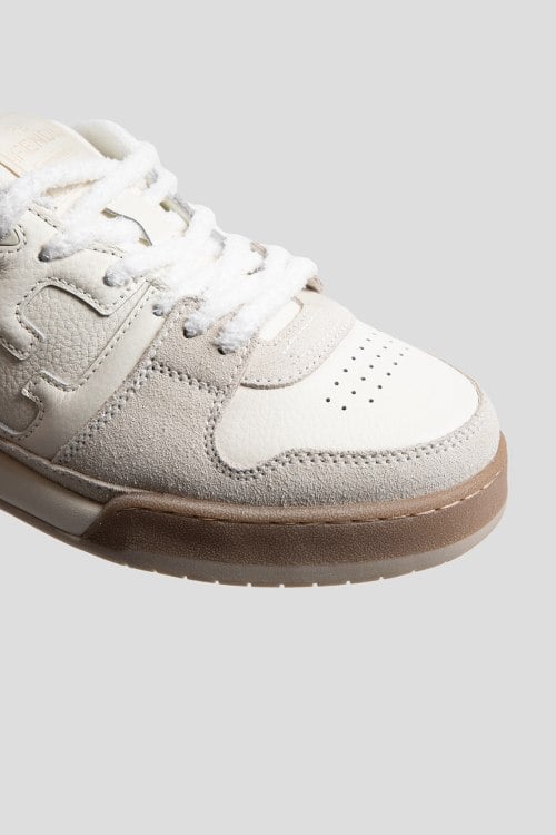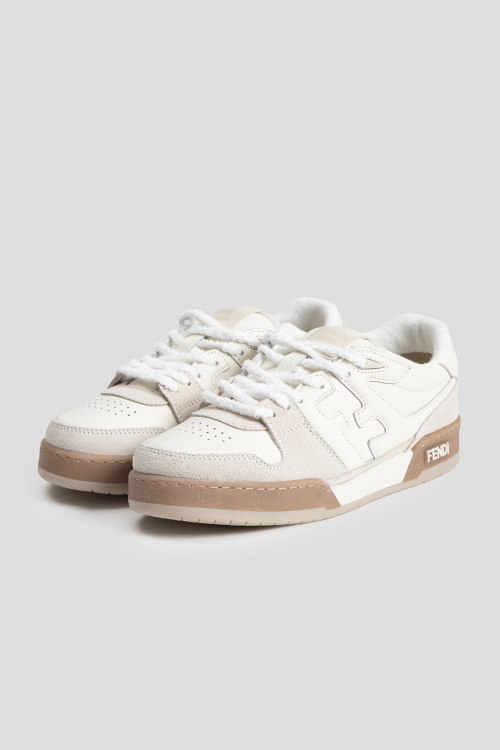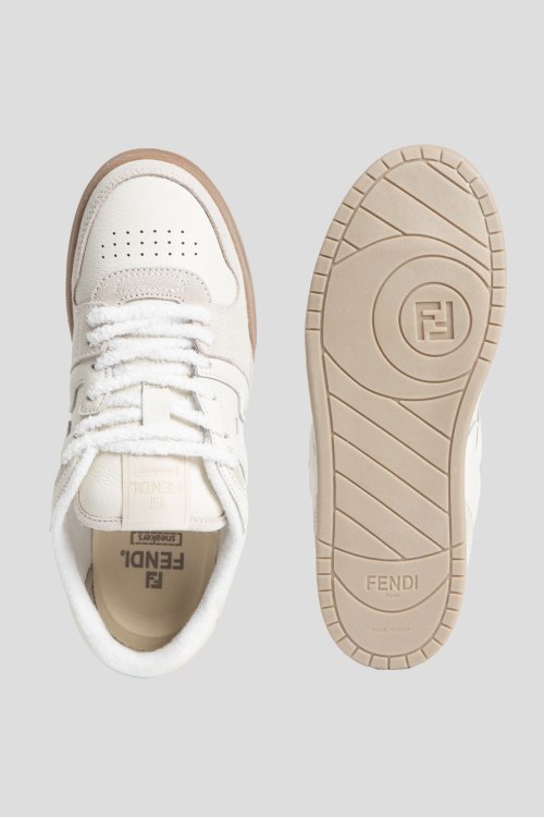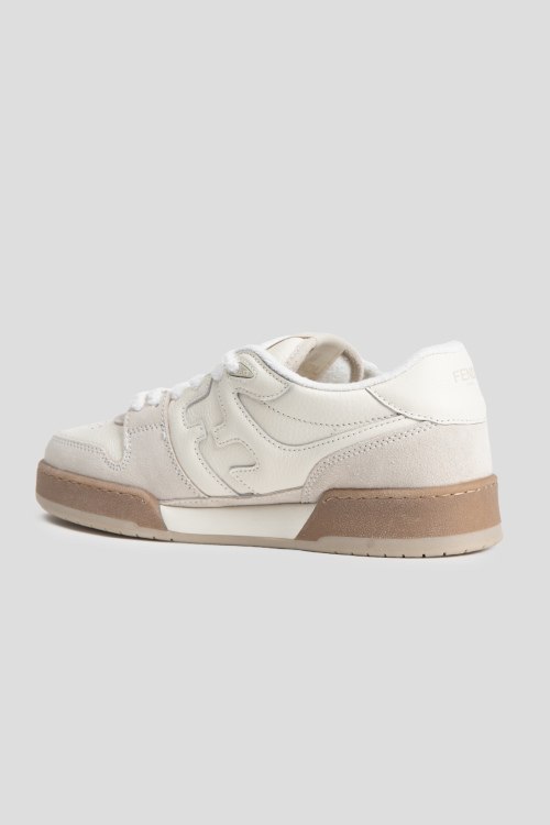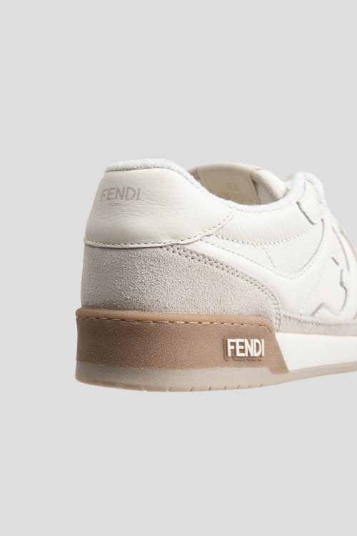 Детали: Мужские кожаные кеды молочного оттенка от Fendi (Фенди). Модель из зернистой кожи, замшевые вставки, логотип сбоку и на язычке, классическая шнуровка, закругленный носок, брендированная подошва