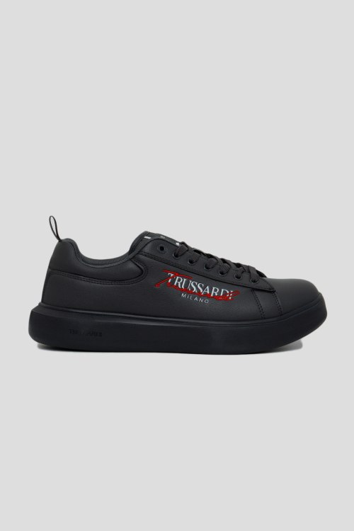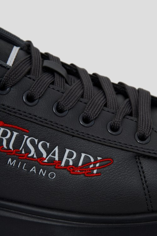 Детали: Мужские темно-серые кеды из экокожи от Trussardi (Труссарди). Вышивка логотипа сбоку, нашивка логотипа на язычке, петля для подтягивания, закругленный носок, классическая шнуровка, плоская подошва