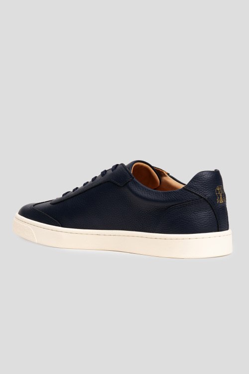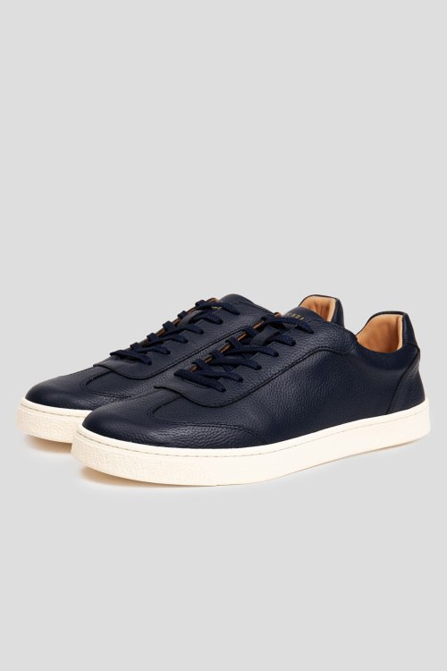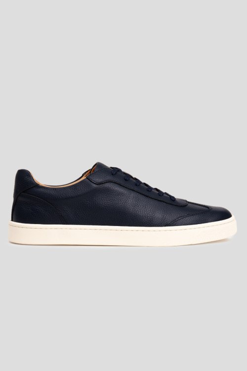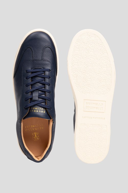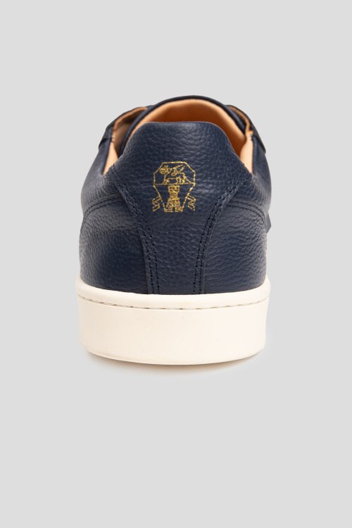 Мужские темно-синие кожаные кеды от Brunello Cucinelli (Брунелло Кучинелли). Модель из зернистой кожи, логотип на язычке, классическая шнуровка, закругленный носок. Обувь категории outlet, коробка может быть повреждена. Обувь маломерит на 1 размер