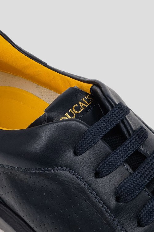 Детали: Мужские темно-синие кожаные кеды от Doucal's (Дукалс). Модель из гладкой кожи, перфорированные вставки, логотип на язычке, классическая шнуровка, закругленный носок