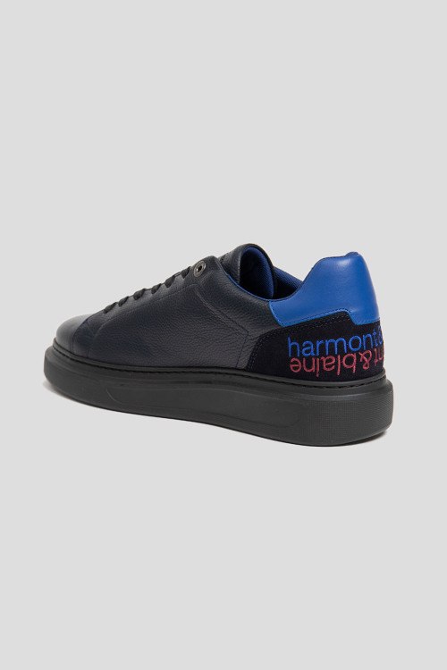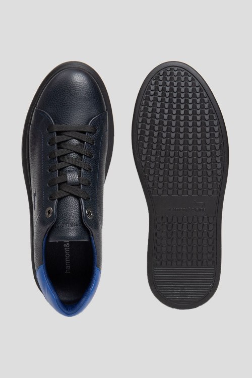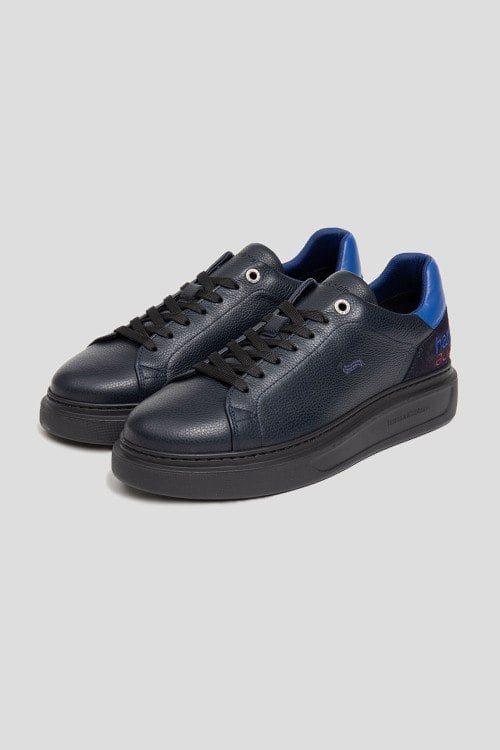 Детали: Мужские темно-синие кеды из натуральной кожи от Harmont & Blaine (Хармонт энд Блейн). Закругленный носок, спереди классическая шнуровка, контрастная вставка на заднике, вышитый логотип бренда спереди и на заднике