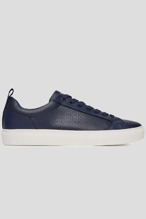 Детали: Мужские темно-синие кеды из экокожи Morien Tenn от Hugo by Hugo Boss (Хуго бай Хуго Босс). Принт с монограммой, логотип на язычке, классическая шнуровка, петля для подтягивания сзади, закругленный носок, белая подошва