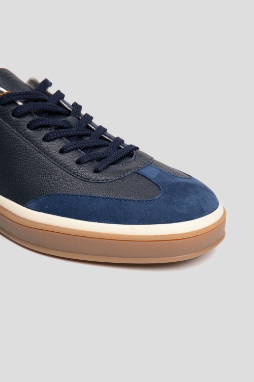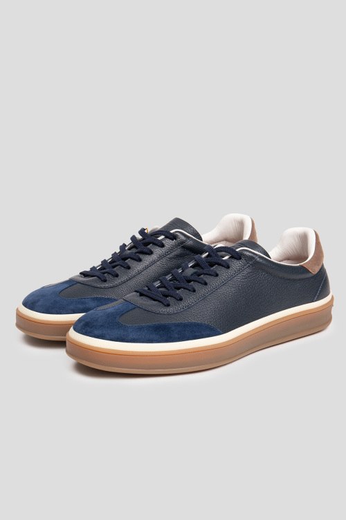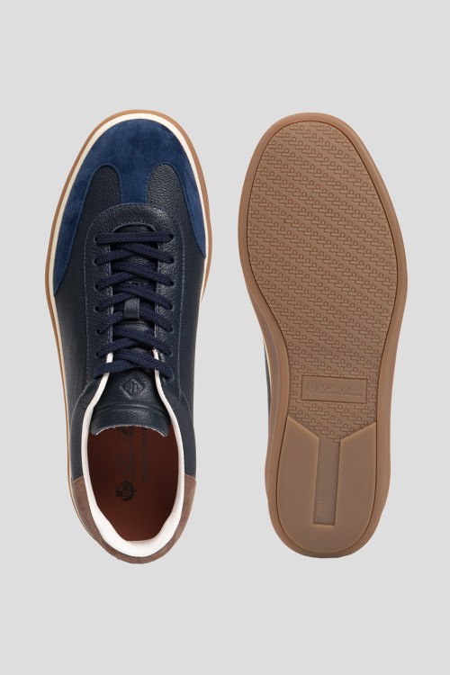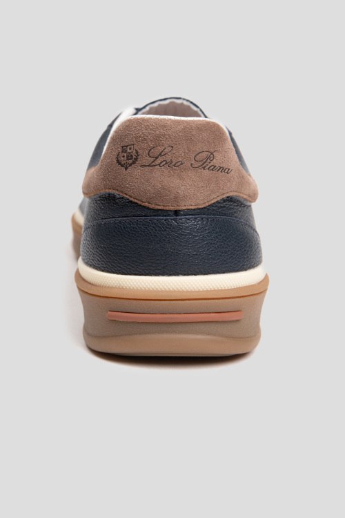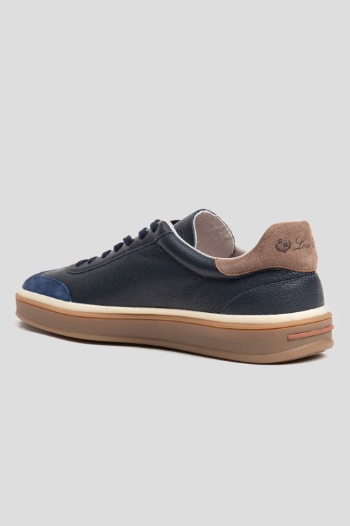Детали: Мужские темно-синие кожаные кеды от Loro Piana (Лоро Пьяна). Модель из зернистой кожи, логотип сбоку на пятке, классическая шнуровка, закругленный носок, коричневая подошва. Обувь категории outlet, коробка может быть повреждена