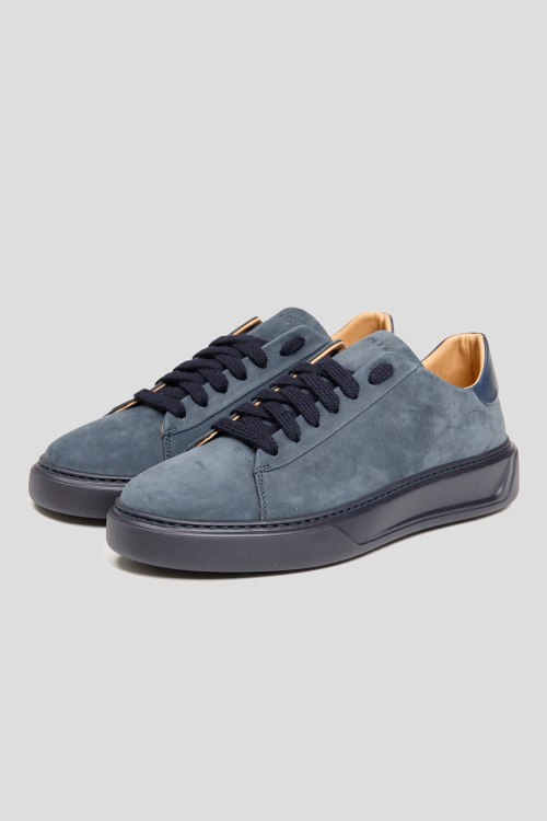 Детали: Мужские синие кеды из нубука от Stokton (Стоктон). Закругленный носок, спереди классическая шнуровка, тиснение с логотипом бренда, кожаная стелька, плоская подошва синего цвета