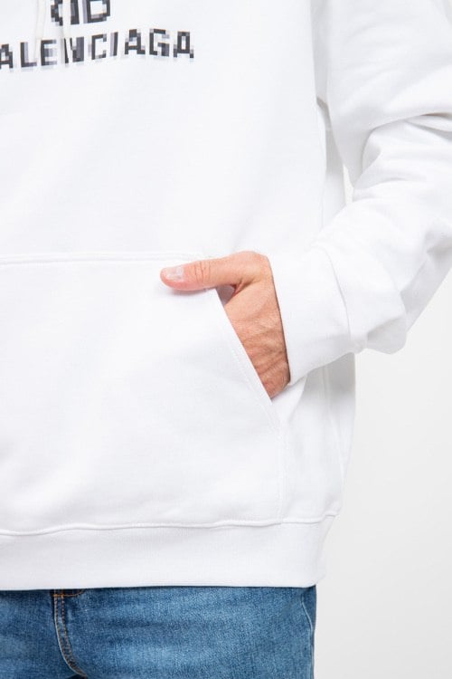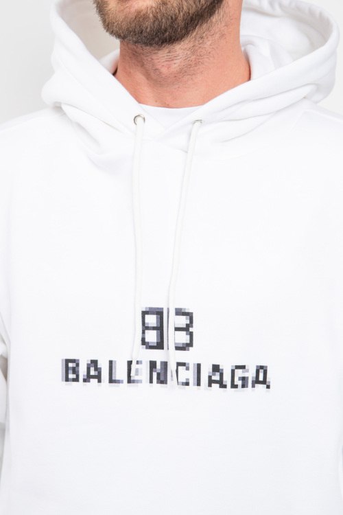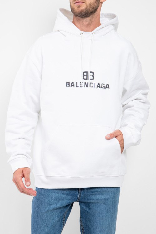 Мужской белый хлопковый худи от Balenciaga (Баленсиага). Капюшон на завязках, принт с логотипом на груди, карман-кенгуру, классическая длина, трикотажные манжеты и нижний край.