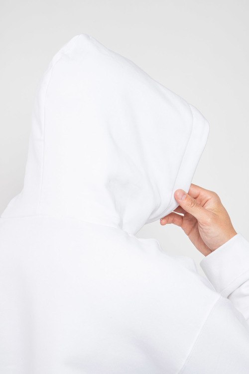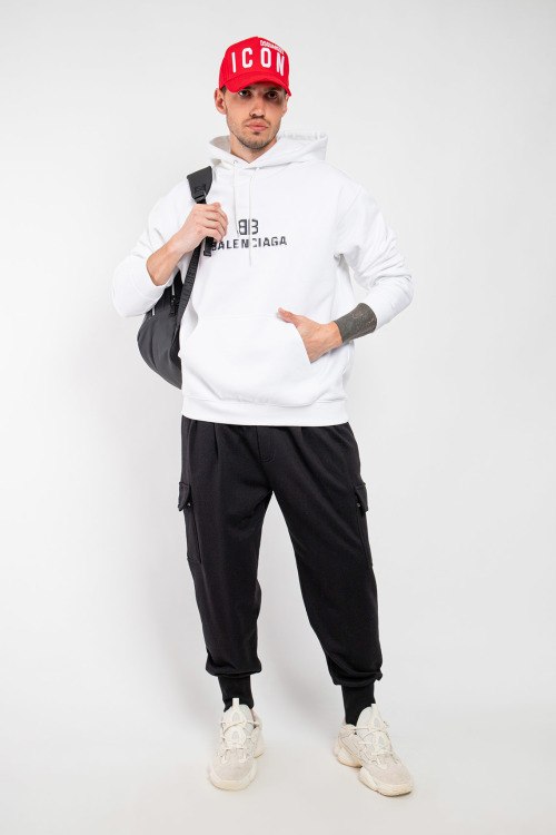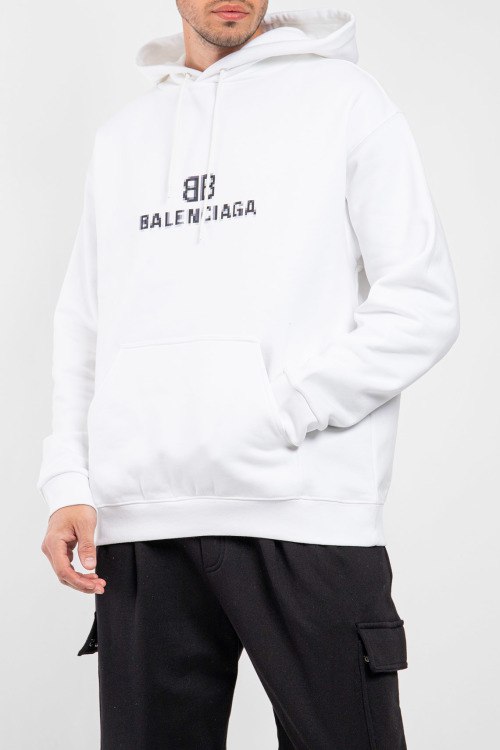 Мужской белый худи из хлопка от Balenciaga (Баленсиага). Классическая длина, вшитый капюшон, длинные рукава, трикотажная резинка на манжетах и по низу изделия, принт с логотипом бренда на груди, модель утепленная флисом, карман-кенгуру.
