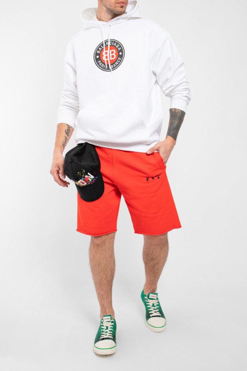 Мужской белый худи из хлопка от Balenciaga (Баленсиага). Классическая длина, вшитый капюшон с кулиской, длинные рукава, трикотажная резинка на манжетах и по низу изделия, карман-кенгуру, принт с логотипом бренда спереди.