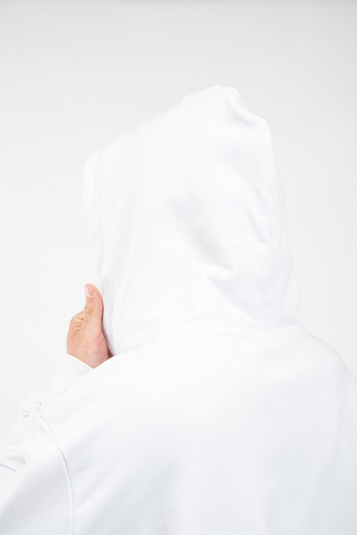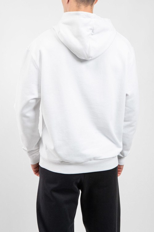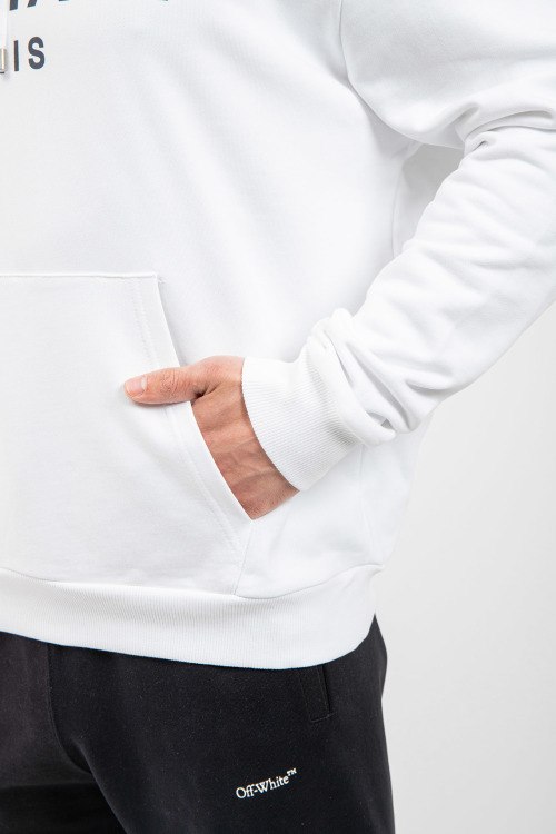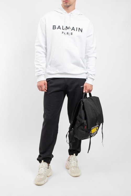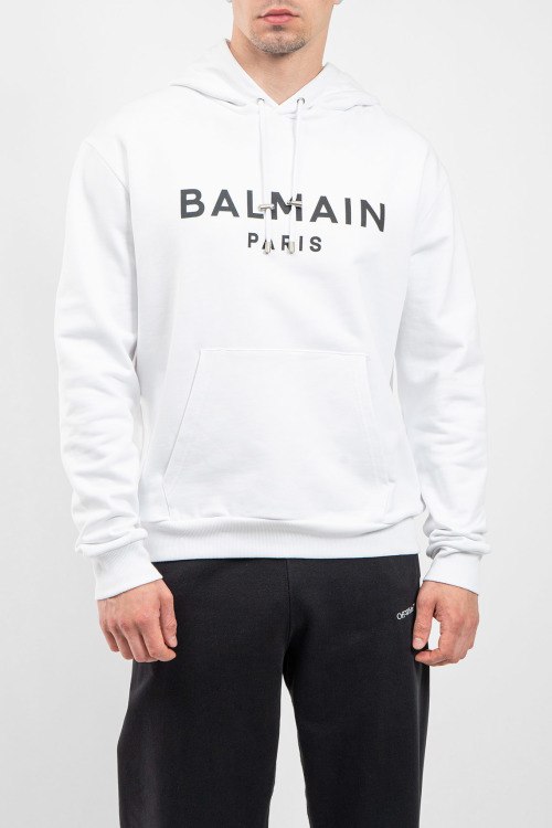 Мужской белый хлопковый худи от Balmain (Бальман). Классическая длина, вшитый капюшон, длинные рукава, трикотажная резинка на манжетах и по низу изделия, дизайн с принтом на груди.
