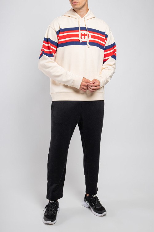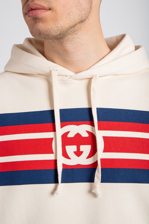 Мужской хлопковый худи молочного оттенка от Gucci (Гуччи). Принт с логотипом, принт в полоску, вшитый капюшон, классическая длина, трикотажные манжеты и нижний край