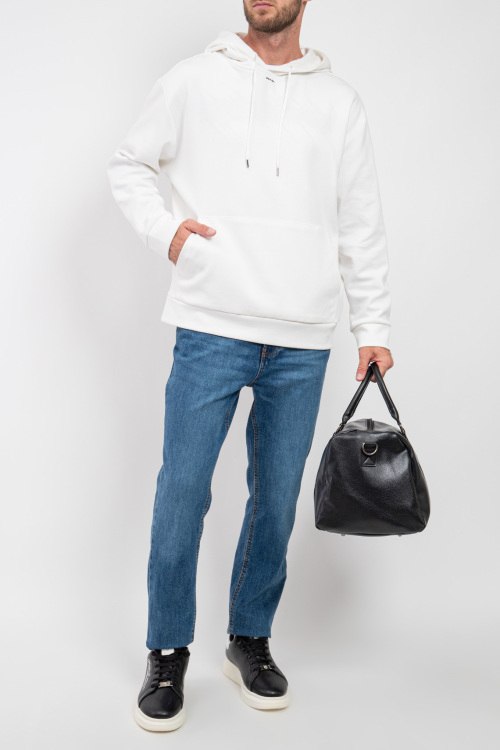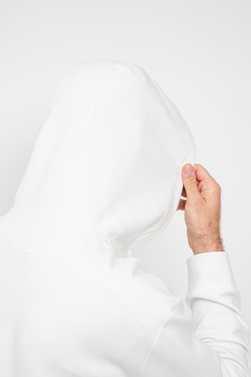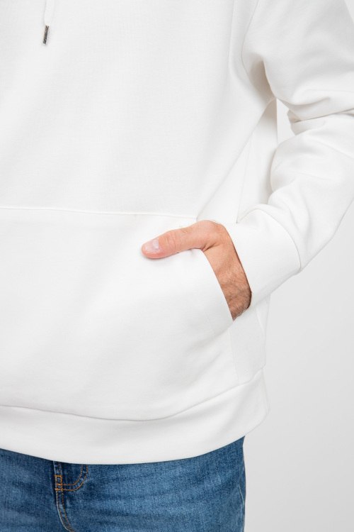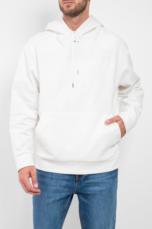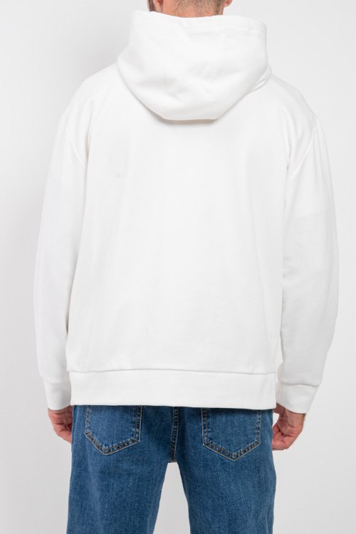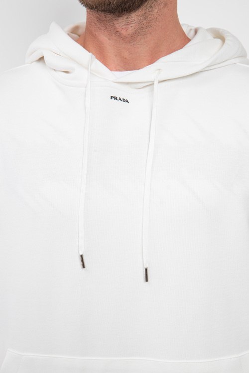 Мужской белый хлопковый худи от Prada (Прада). Капюшон на завязках, принт с логотипом, карман-кенгуру, классическая длина, трикотажные манжеты и нижний край.
