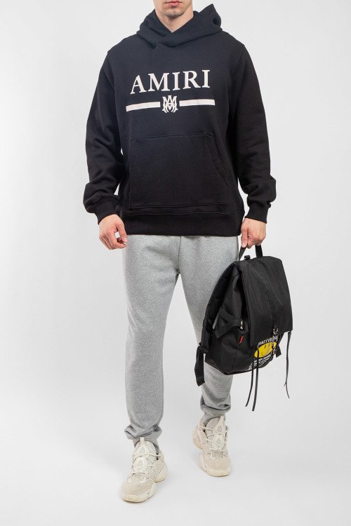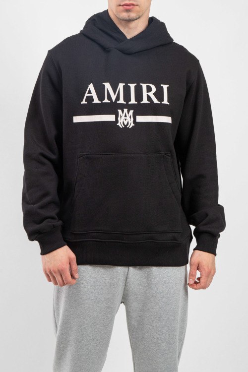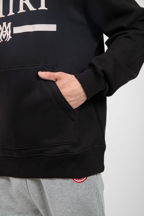 Мужской черный худи из хлопка от Amiri (Амири). Фасон oversize, вшитый капюшон, длинные рукава, карман-кенгуру, брендированный принт на груди. Замеры для размера: S; длина - 69см; ПОГ - 61 см; ПОТ - 58 см; ПОБ - 54 см; длина по внутреннему шву рукава - 49,5 см; ширина рукава - 23 см.