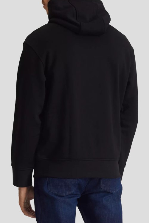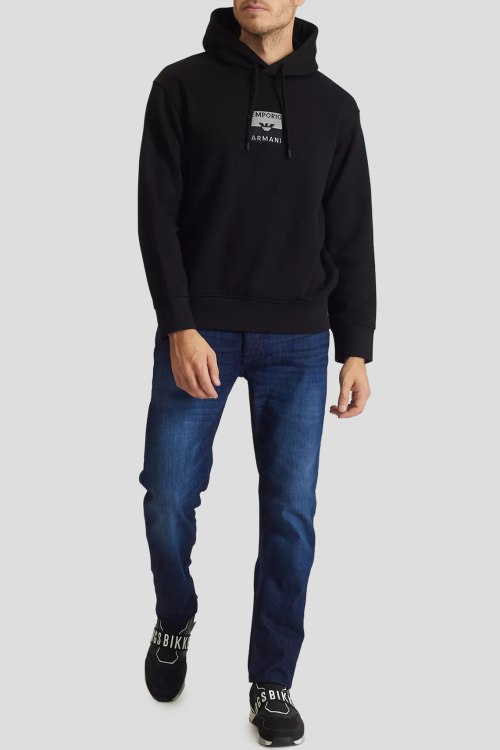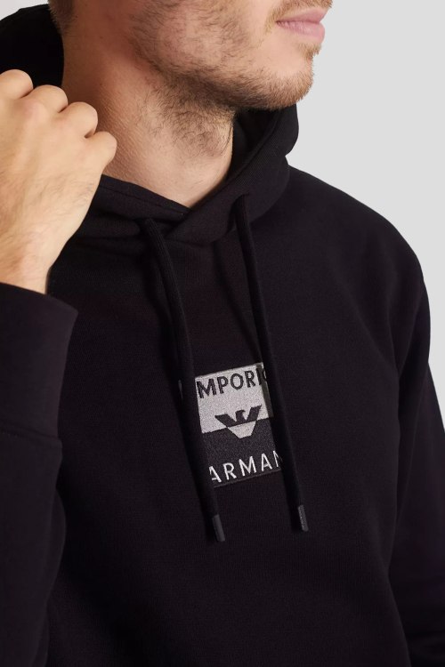 Детали: Мужской черный хлопковый худи от Armani (Армани). Капюшон на завязках, логотип на груди, классическая длина, трикотажные манжеты и нижний край