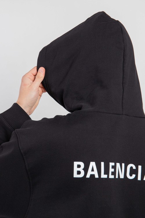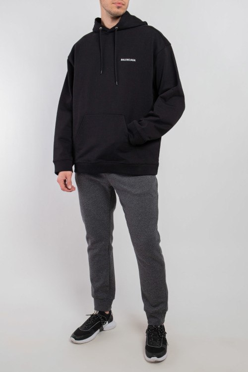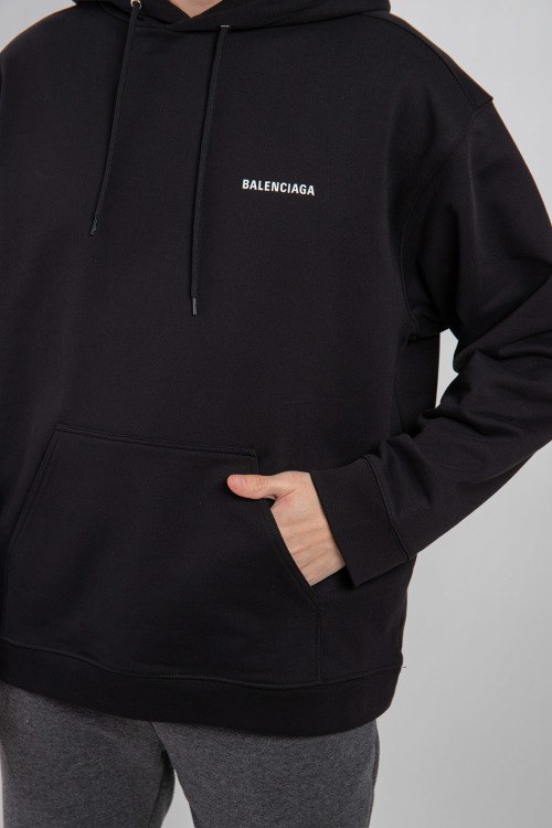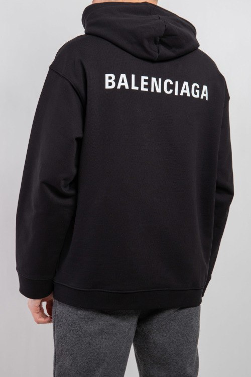 Мужской черный хлопковый худи от Balenciaga (Баленсиага). Капюшон на завязках, принт с логотипом на груди и на спине, карман-кенгуру, классическая длина, трикотажные манжеты и нижний край