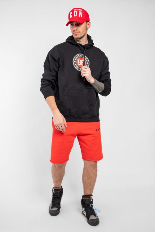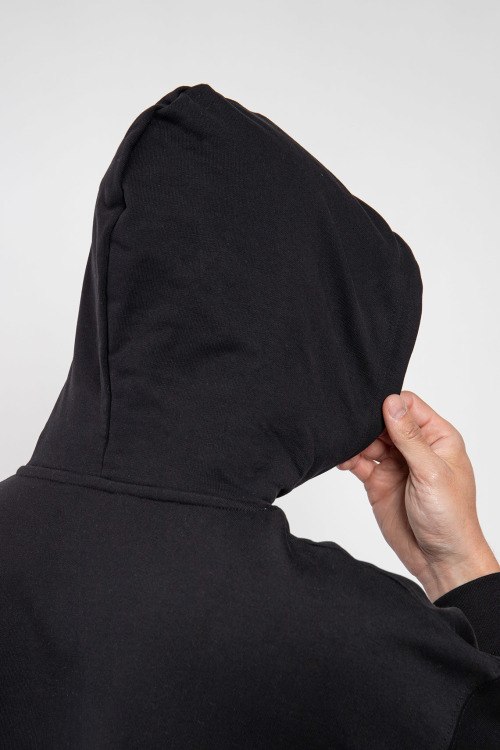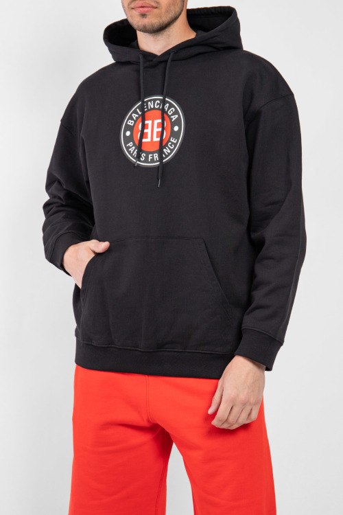 Мужской черный худи из хлопка от Balenciaga (Баленсиага). Классическая длина, вшитый капюшон с кулиской, длинные рукава, трикотажная резинка на манжетах и по низу изделия, карман-кенгуру, принт с логотипом бренда спереди.
