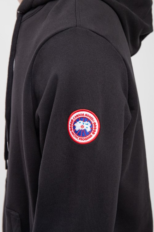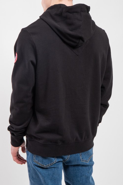 Мужской черный худи из хлопка от Canada Goose (Канада Гус). Классическая длина, вшитый капюшон с кулиской, длинные рукава, трикотажная резинка на манжетах и по низу изделия, патч-лого на рукаве, карман-кенгуру. Замеры: р.L (ширина по плечам 45 см, ширина по груди 57 см, ширина по талии 50 см, длина изделия 75 см.), р.XL (ширина по плечам 49 см, ширина по груди 61 см, ширина по талии 52 см, длина изделия 76 см.)