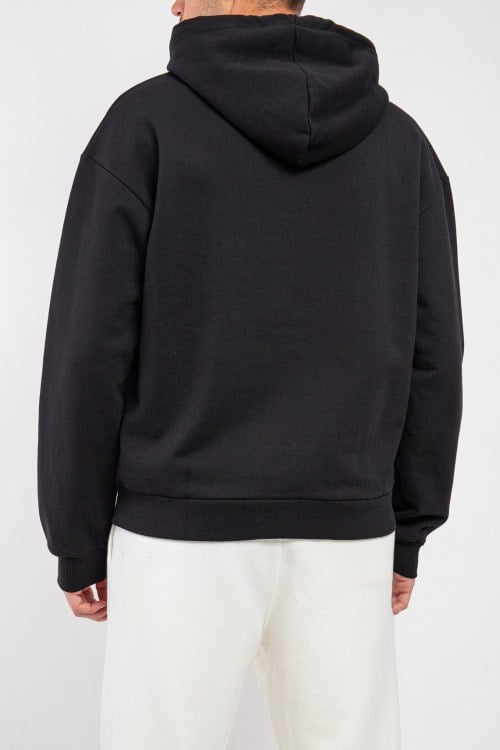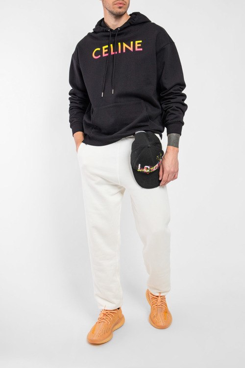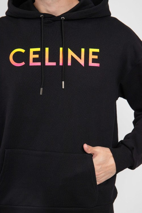 Мужской черный худи из хлопка от Celine (Селин). Вшитый капюшон, длинные рукава, трикотажная резинка на манжета и по низу изделия, карман-кенгуру, принт на груди Celine.