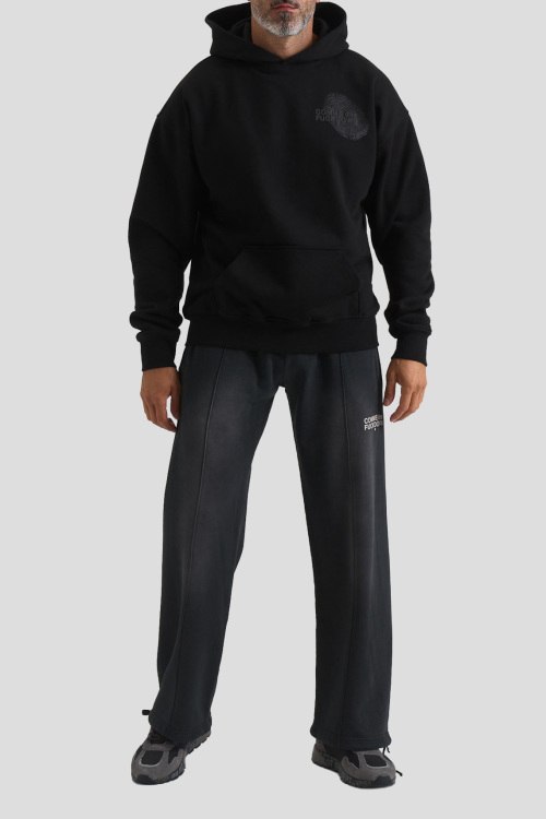 Детали: Мужской черный худи из хлопкового микса от Comme des Fuckdown (Камм дес Факдаун). Вшитый капюшон, длинные рукава, трикотажная резинка на манжетах и по низу изделия, модель декорирована принтом на спине и на груди с логотипом бренда
