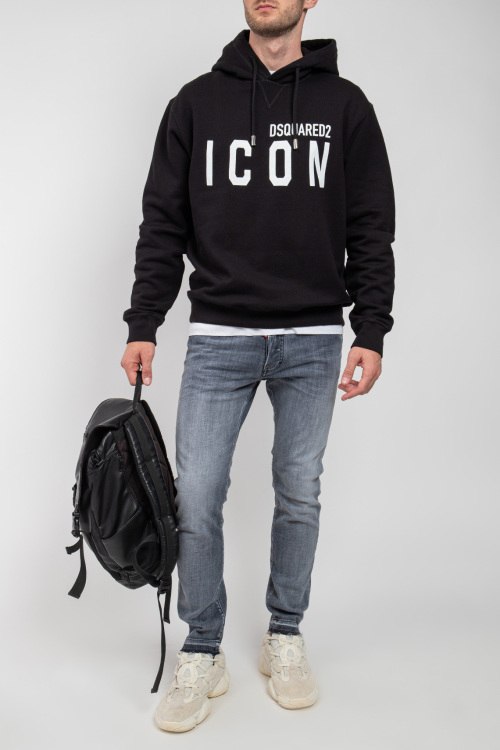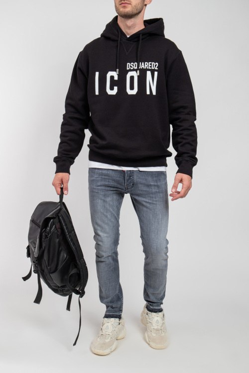 Мужской черный худи Icon из хлопка от Dsquared2 (Дискваред). Классическая длина, вшитый капюшон, длинные рукава, трикотажная резинка на манжетах и по низу изделия, принт с логотипом бренда и с фирменной надписью.