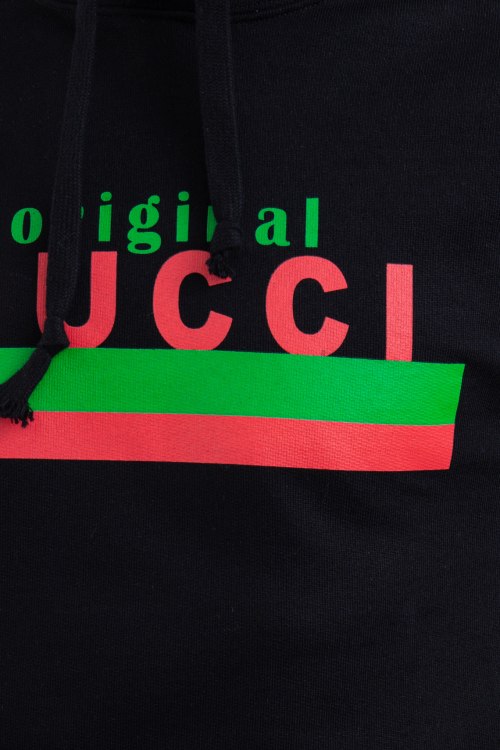 Мужской черный хлопковый худи от Gucci (Гуччи). Модель с капюшоном на затяжке, спереди карман-кенгуру. Низ изделия и манжеты в рубчик. Брендовый принт на груди в красно-зеленых тонах.