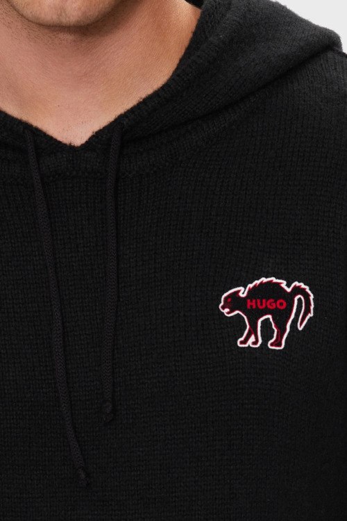 Детали: Мужской черный худи Scuud из шерстяного микса от Hugo by Hugo Boss (Хуго бай Хуго Босс). Вшитый капюшон, классическая длина, патч-лого, трикотажная резинка на манжетах и по низу изделия